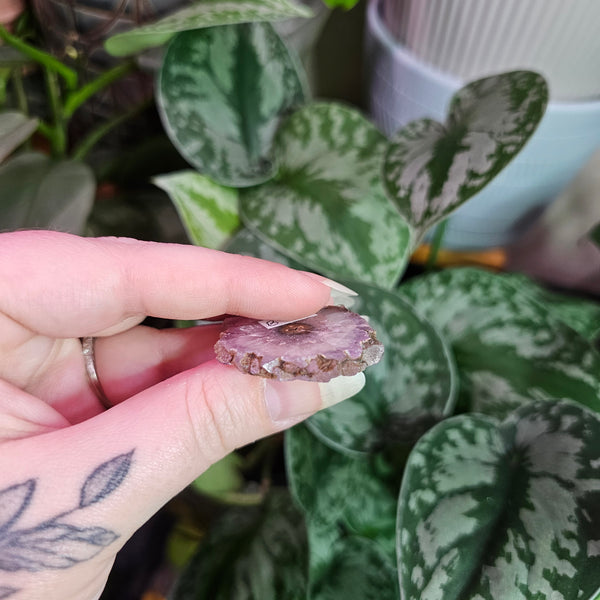 This slice has some remaining matrix and dirt deeply seated among the druzy points of the border. Unfortunately, due to my chronic illness, I am unable to use anything stronger than unscented dish soap, which isn't quite strong enough for those inclusions. For that reason, this slice has been discounted, but it is still absolutely gorgeous in person.